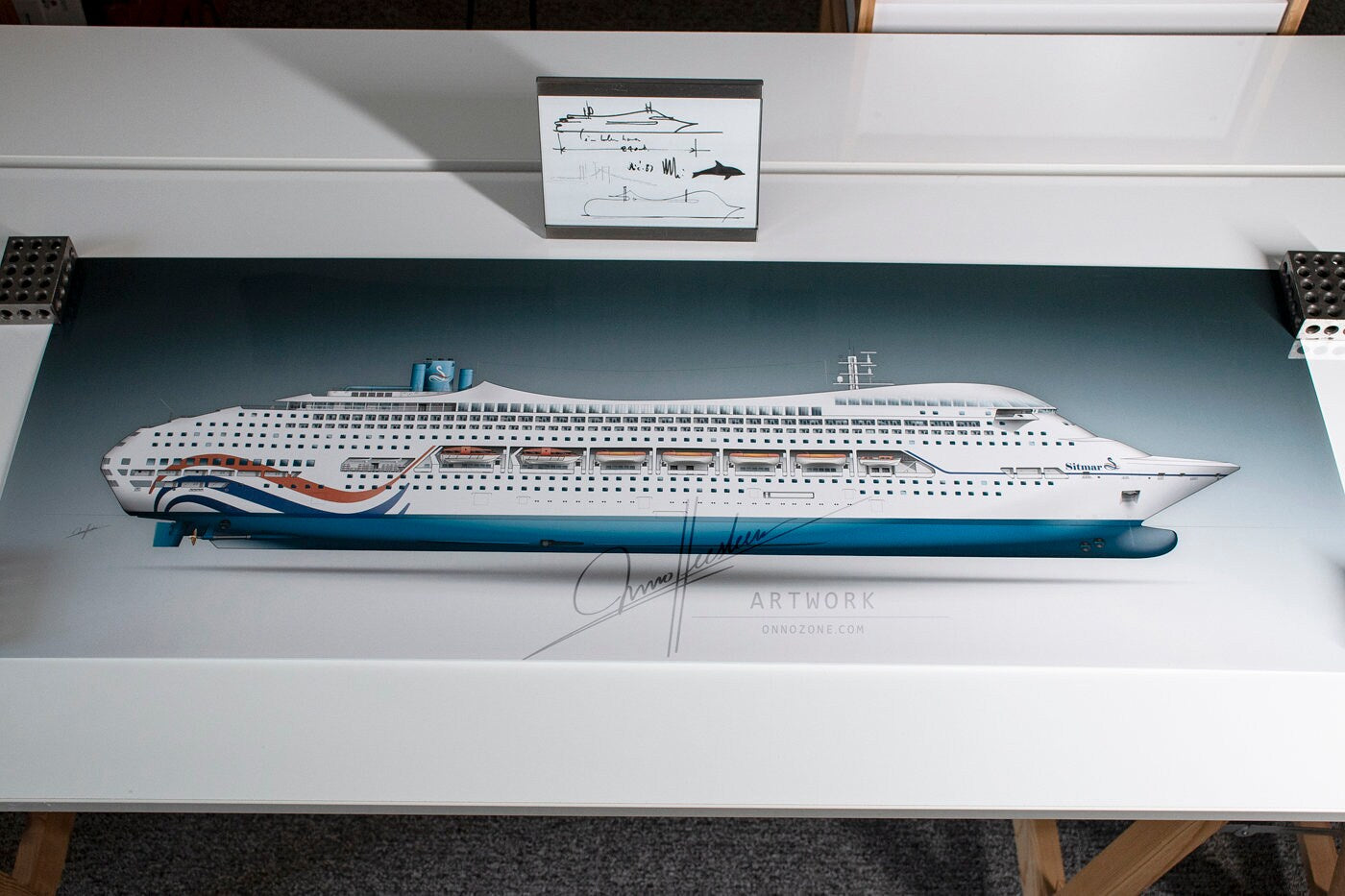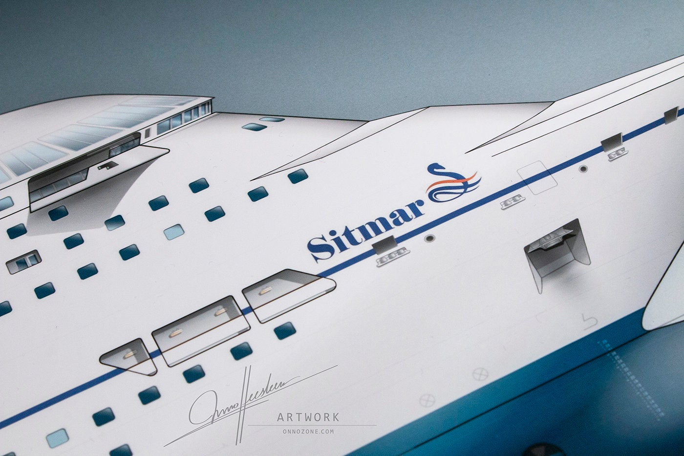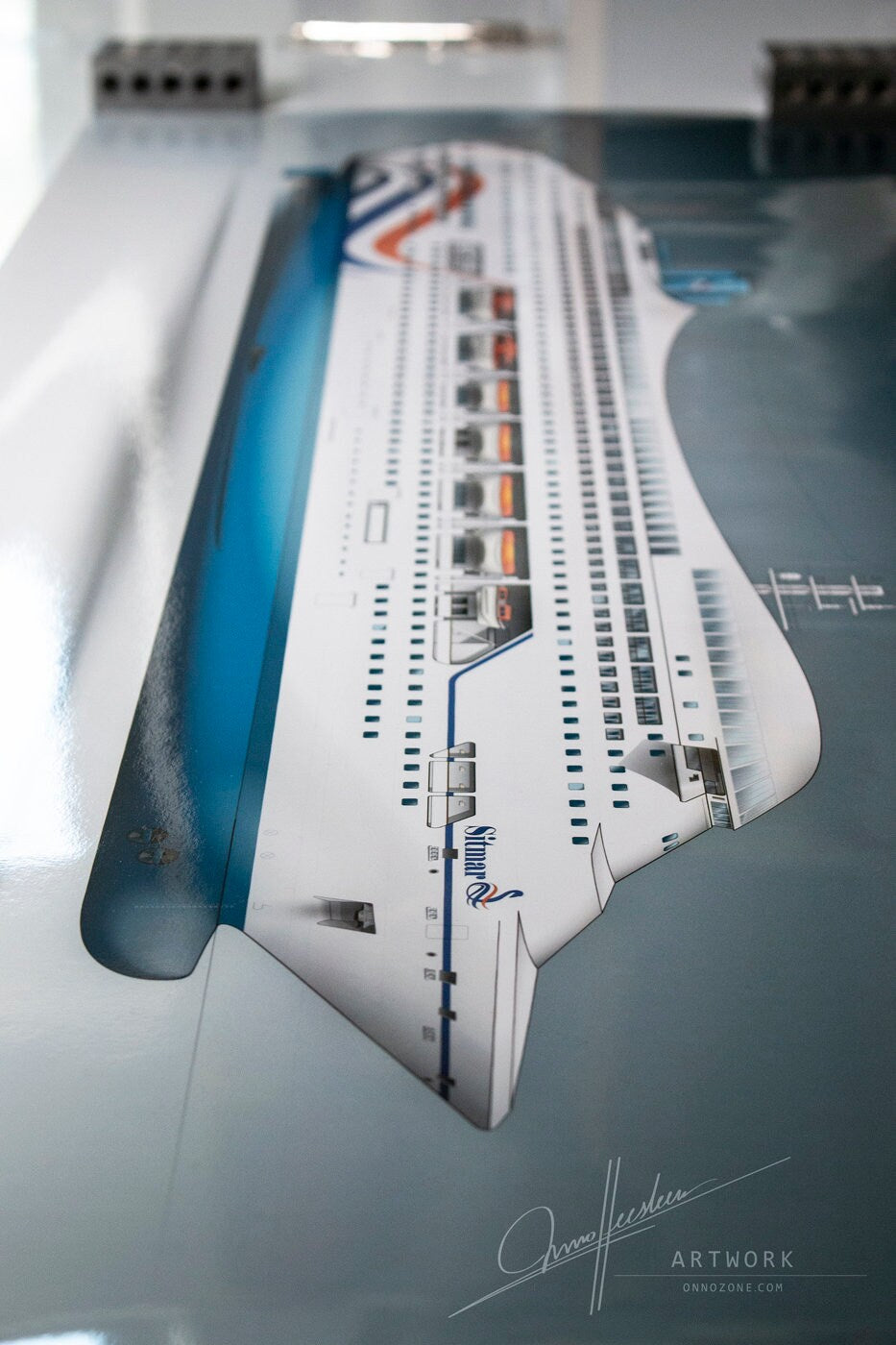 Initially, the ship was intended to be the newest cruise ship class for the Sitmar Line, reflected in this rendition featuring the late 1980s Sitmar livery. Ultimately, the ships were constructed as Crown Princess and Regal Princess for Princess Cruises. While not as bold as the early concepts, they remained remarkably streamlined and distinct from other cruise ships of their time. Today, only one of these twin ships remains in service, sailing as the ms AMBIANCE.