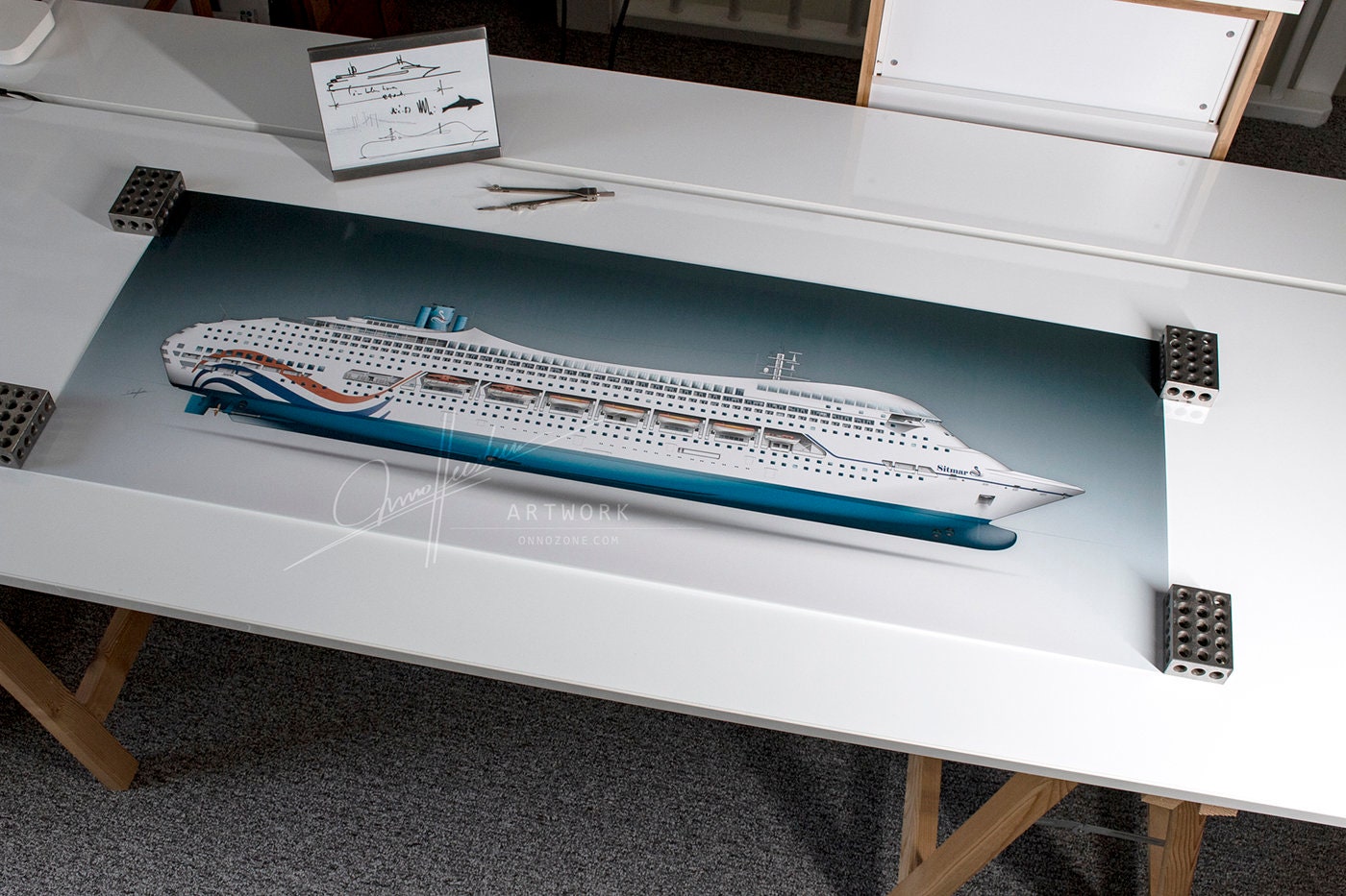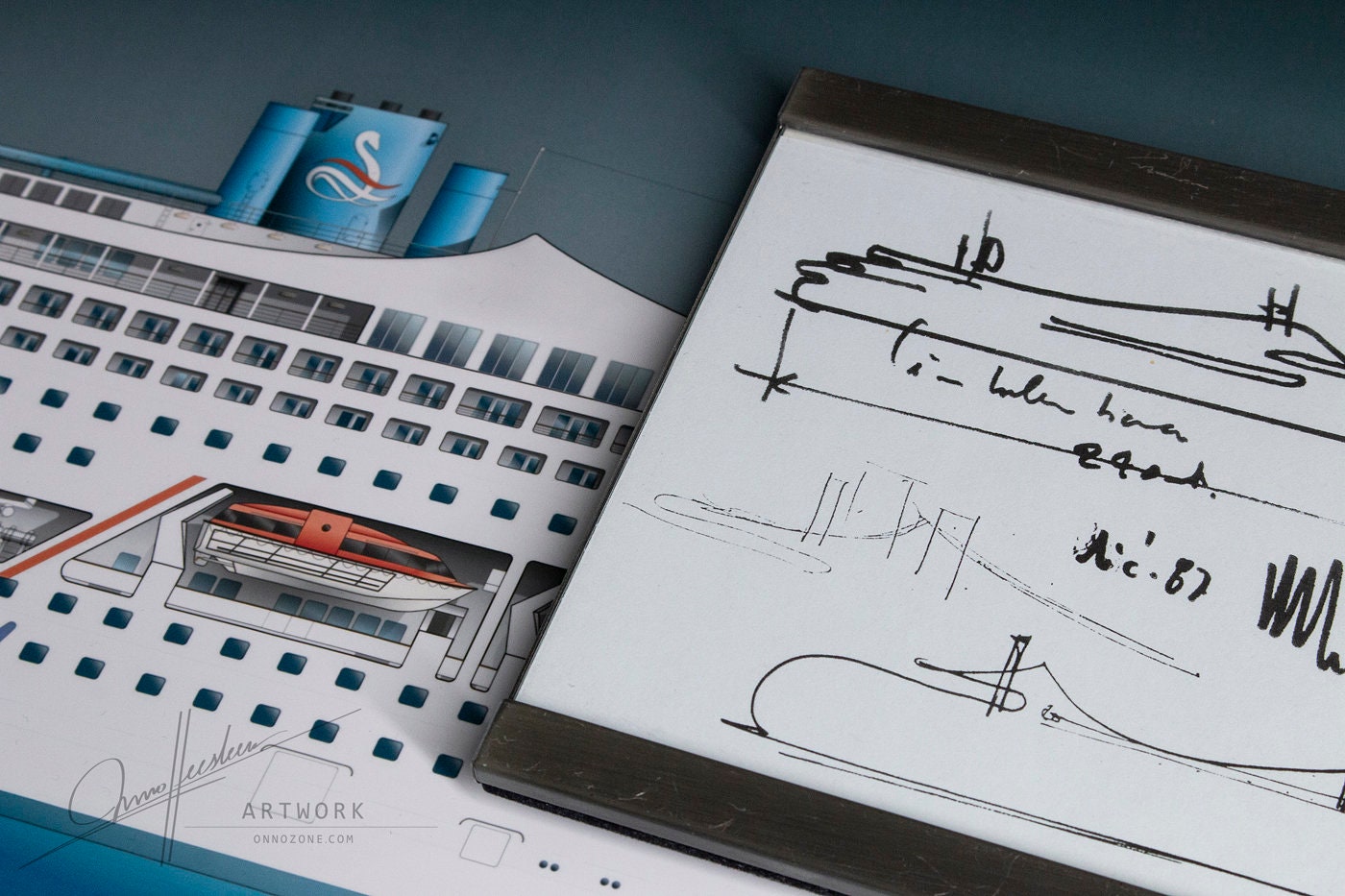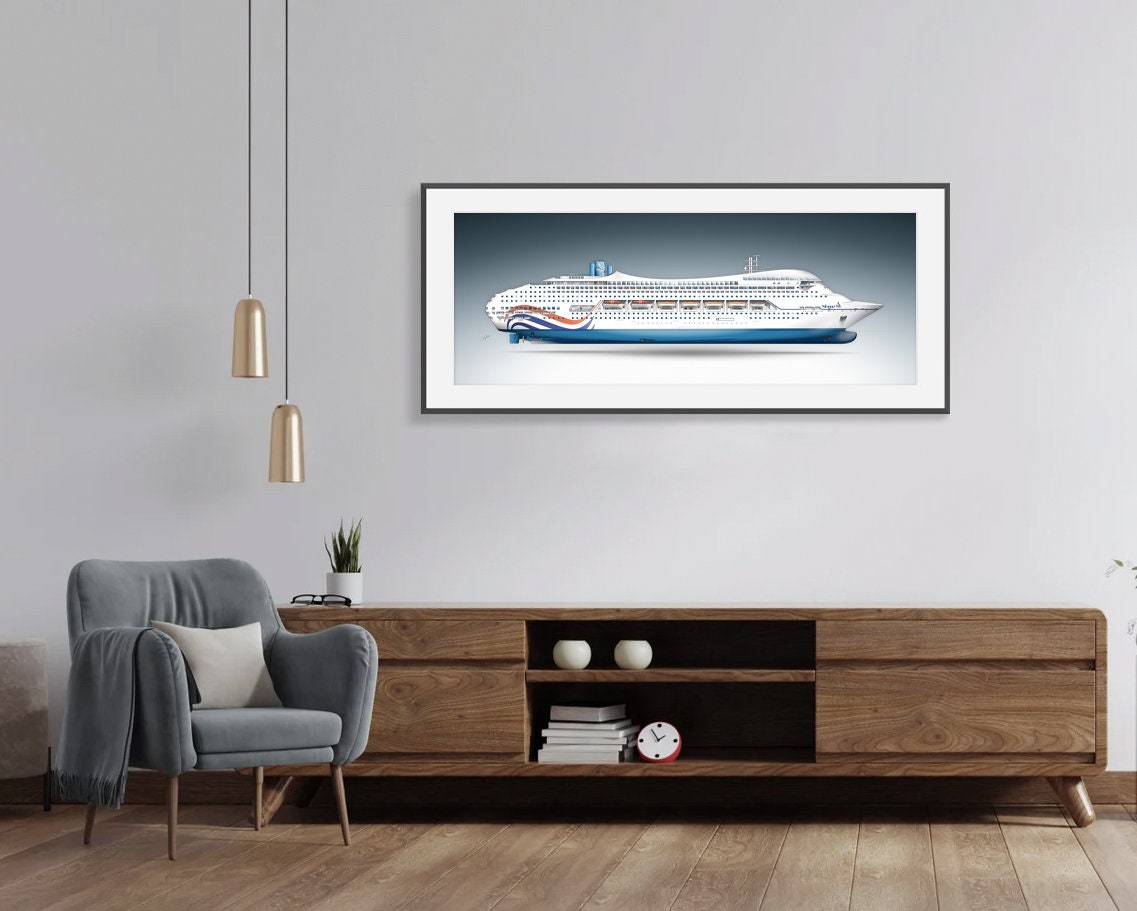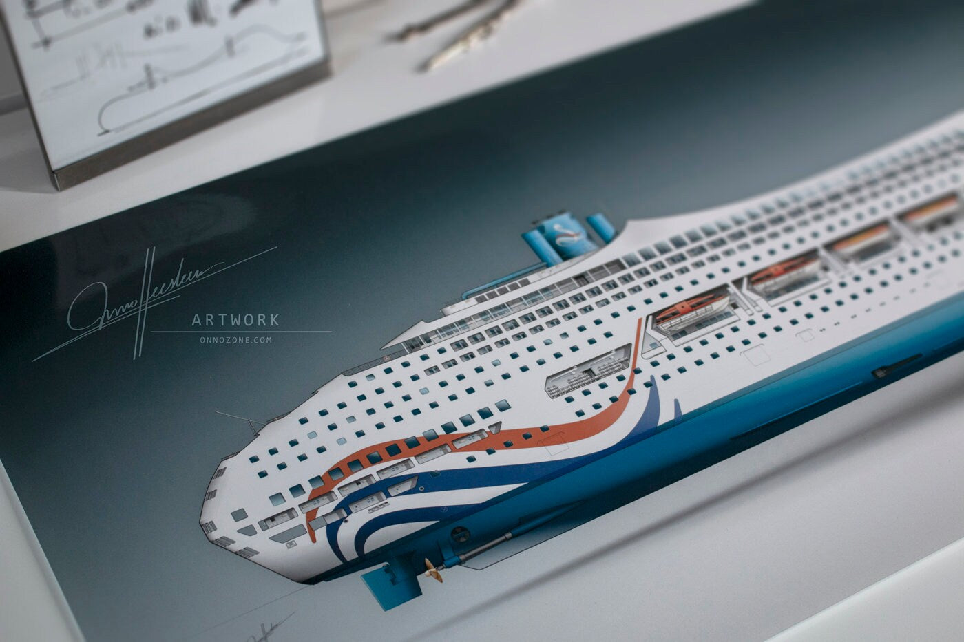 Initially, the ship was intended to be the newest cruise ship class for the Sitmar Line, reflected in this rendition featuring the late 1980s Sitmar livery. Ultimately, the ships were constructed as Crown Princess and Regal Princess for Princess Cruises. While not as bold as the early concepts, they remained remarkably streamlined and distinct from other cruise ships of their time. Today, only one of these twin ships remains in service, sailing as the ms AMBIANCE.