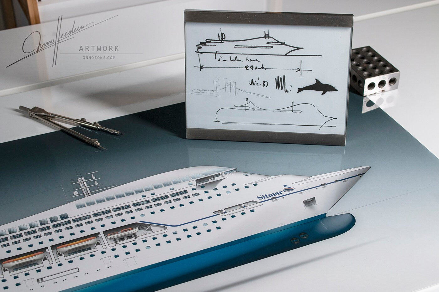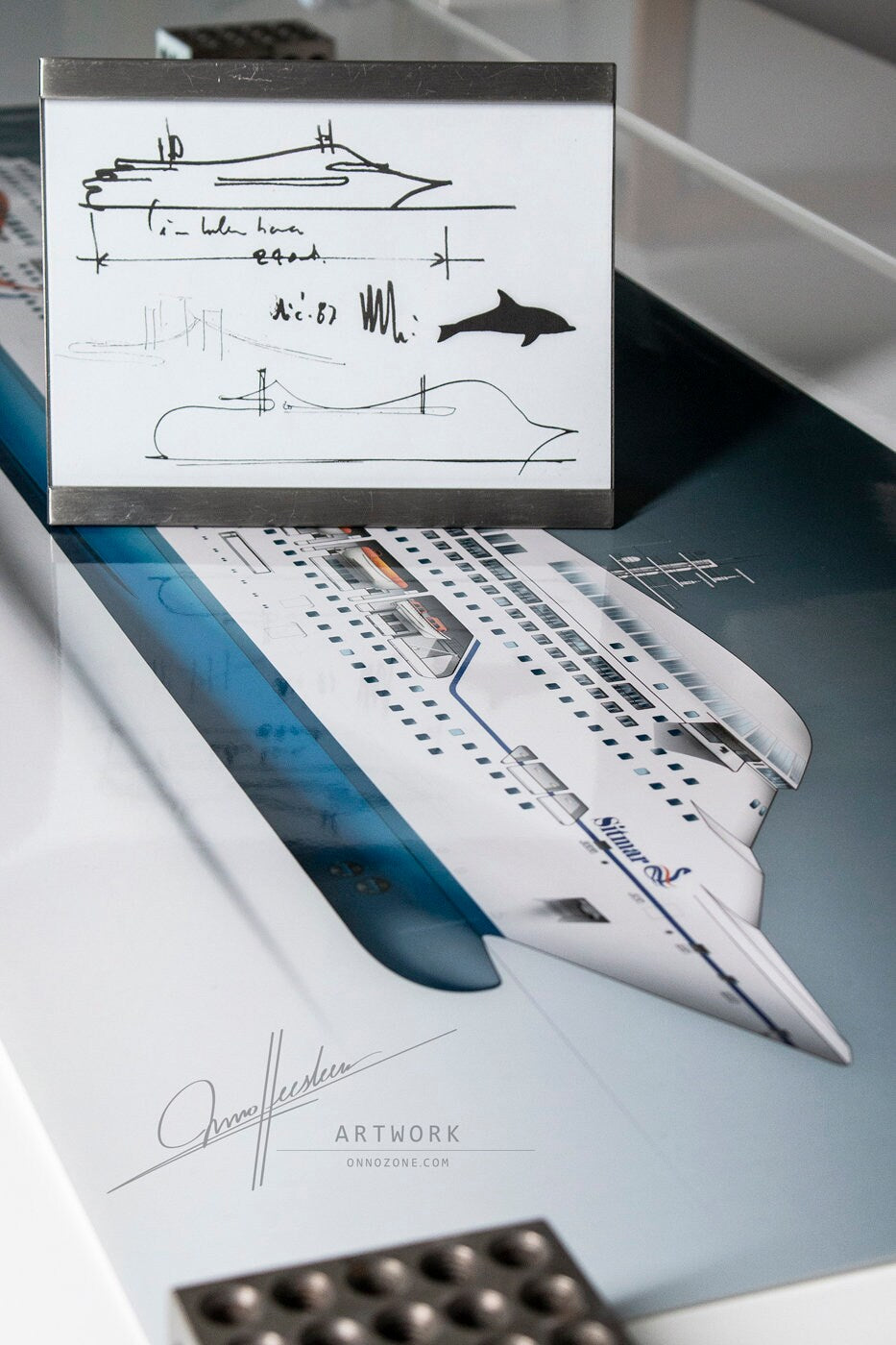 This illustration is inspired by the 1987 “dolphin-shaped” cruise ship concept sketches by renowned Italian architect Renzo Piano. Drawing inspiration from the graceful form of dolphins in the water, Piano aimed to counter the trend of cruise ships resembling anonymous “shoe boxes.” His design incorporated elegant curves to create a magical and memorable profile.