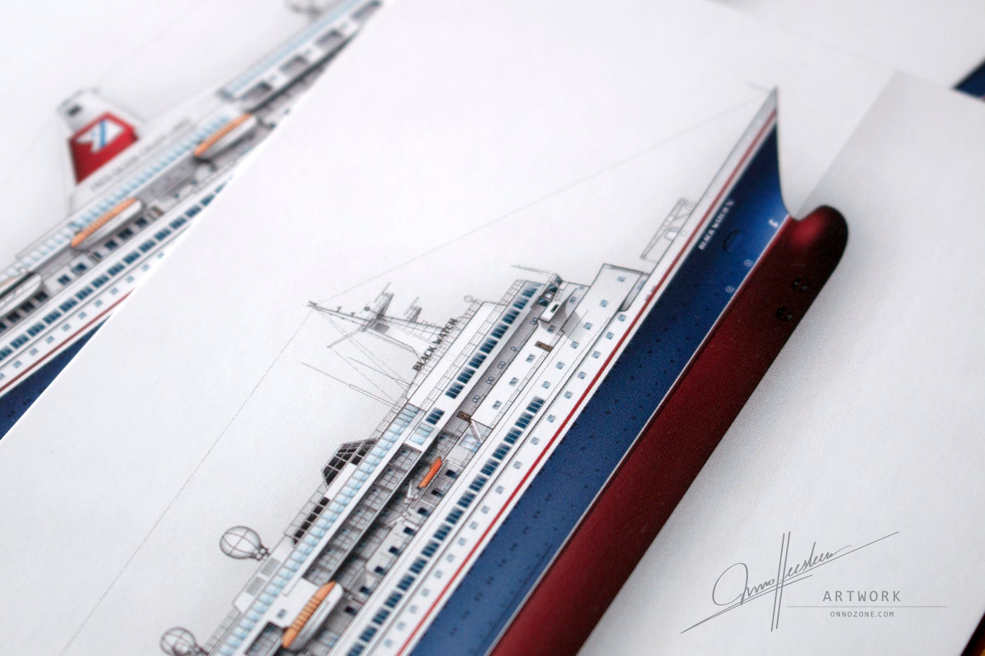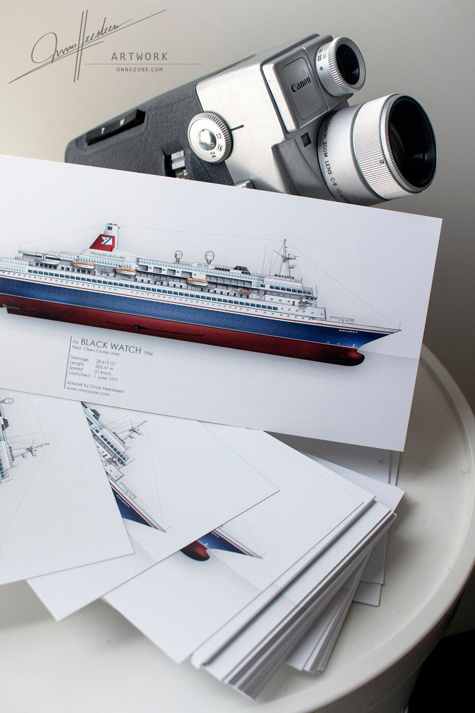 This detailed illustration showcases the MS Black Watch, a cherished cruise ship of Fred. Olsen Cruise Lines. Originally entering service in 1972 as the Royal Viking Star, she joined Fred. Olsen Cruise Lines in 1996 as the Black Watch. Renowned for her popularity among British passengers, she maintained a loyal following until her decommissioning in 2020. Over the years, the ship underwent various liveries and upgrades, and this artwork depicts her with the distinctive dark blue hull from her final years.