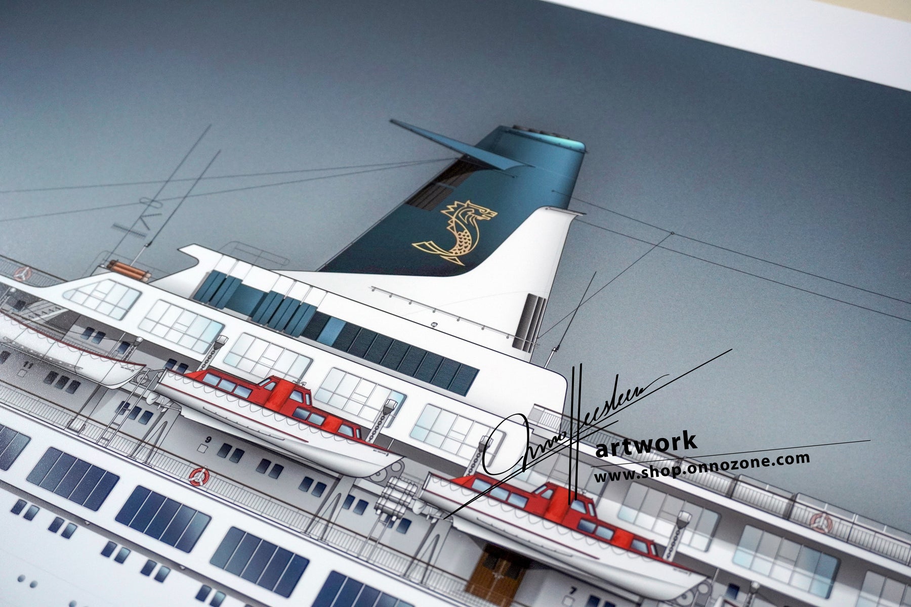 Launched in 1971 for Flagship Cruises, the MS Sea Venture and MS Island Venture represented a bold new era in cruise ship design, featuring the world's first onboard atrium and innovative Scandinavian-inspired interiors with airy public spaces and full-length windows. Notably, Sea Venture heroically rescued over 1,650 passengers from the stricken QE2 in 1974 amid a dramatic Atlantic storm. With their sleek lines, distinctive 1970s elegance, and graceful curves, these pioneering sister ships inspired this detailed illustration, capturing the innovative spirit and timeless allure of these trailblazing vessels.