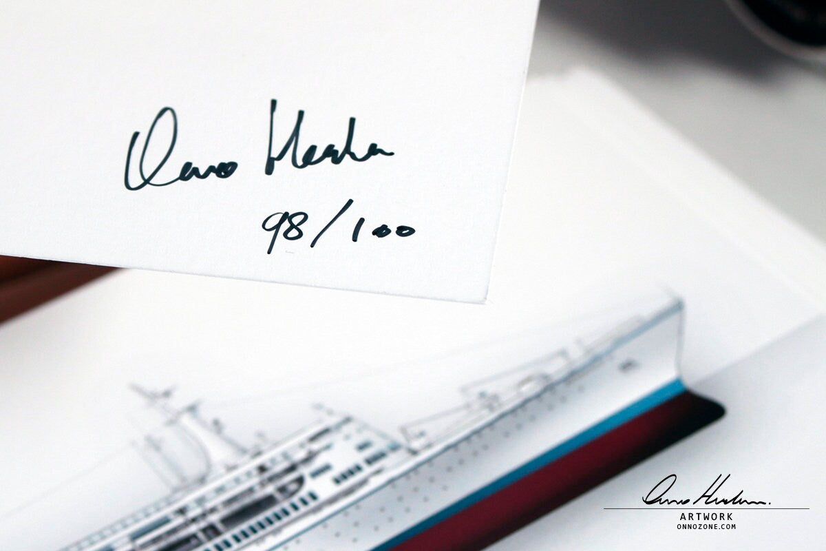 This detailed profile illustration captures the SS Eugenio C as she appeared during her maiden voyage in 1966. Regarded as the most iconic passenger ship to sail for Costa Line, she exemplified the harmonious blend of 1960s Italian design and engineering. Launched on 21 November 1964, the SS Eugenio C served Costa Line until 1996. She later cruised briefly as Edinburgh Castle before joining Premier Cruise Lines as The Big Red Boat II. Her career ended in 2005 when she was scrapped at Alang.