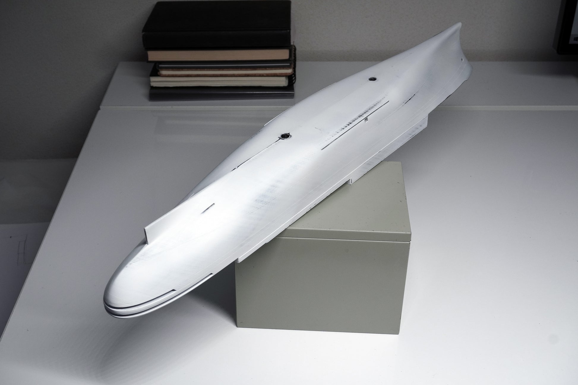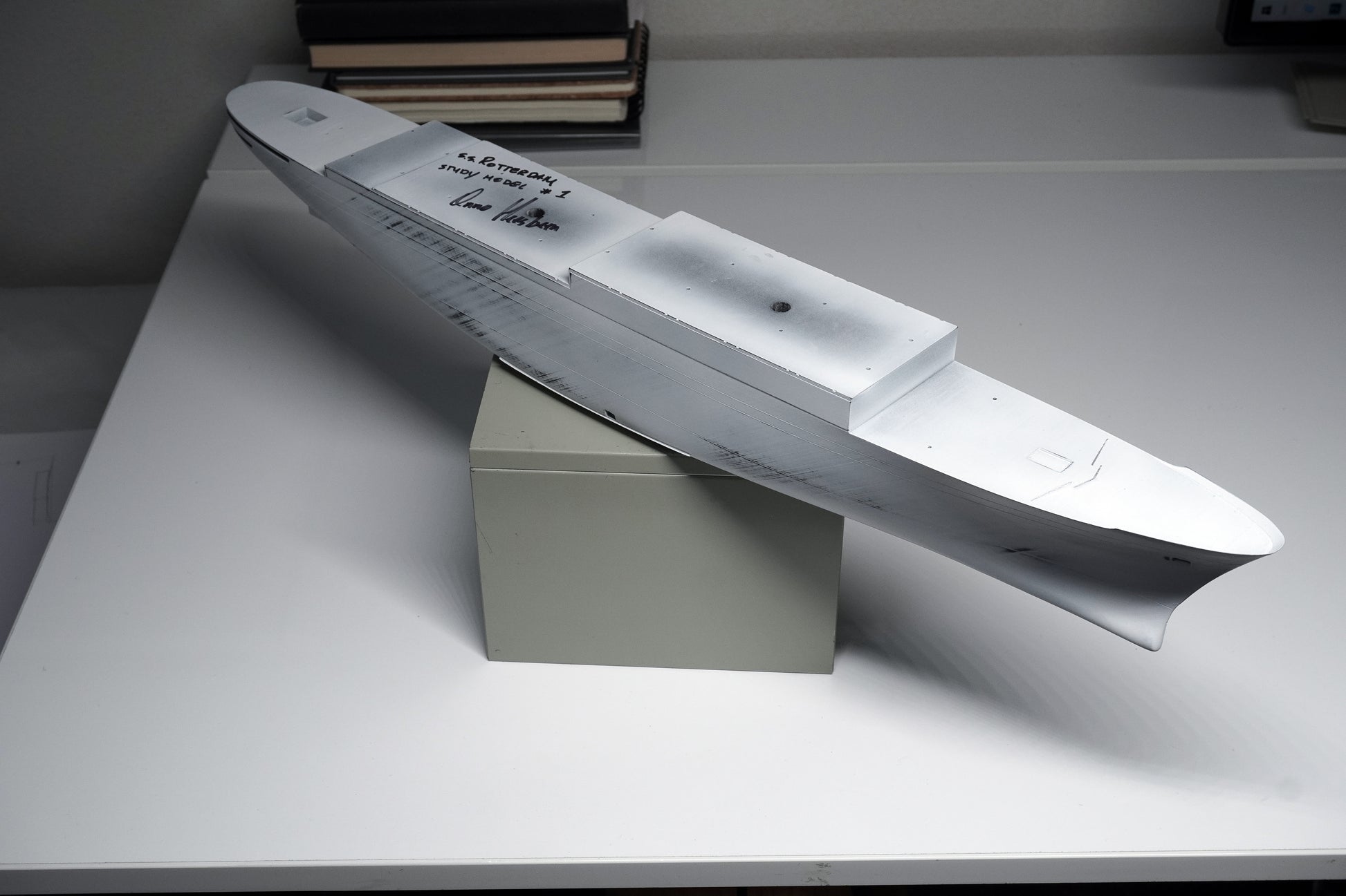 This is a unique chance to own a study piece from my studio, handcrafted as part of my work as a model maker and artist focused on ocean liners and passenger ships. This SS Rotterdam study hull was created during my research to perfect the scale model of the SS Rotterdam.